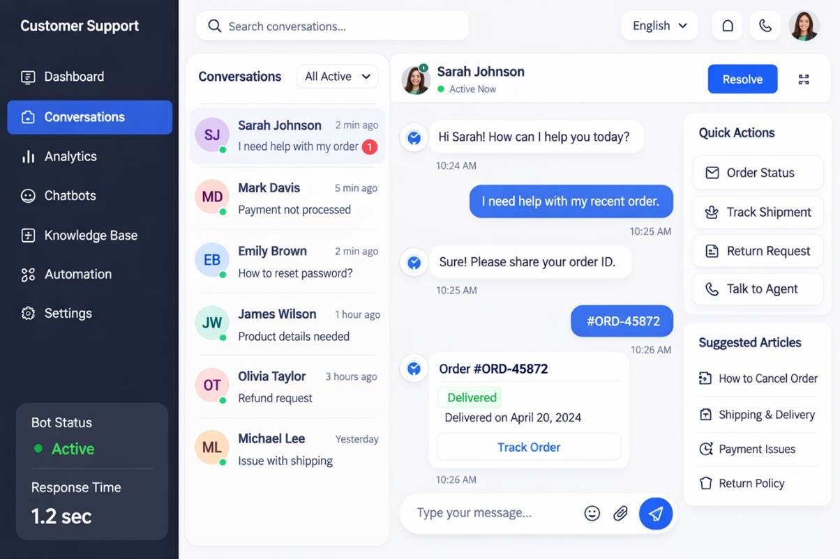 AI chatbots can handle customer inquiries, process requests, provide product recommendations, and operate 24/7 across websites, mobile apps, and messaging platforms.