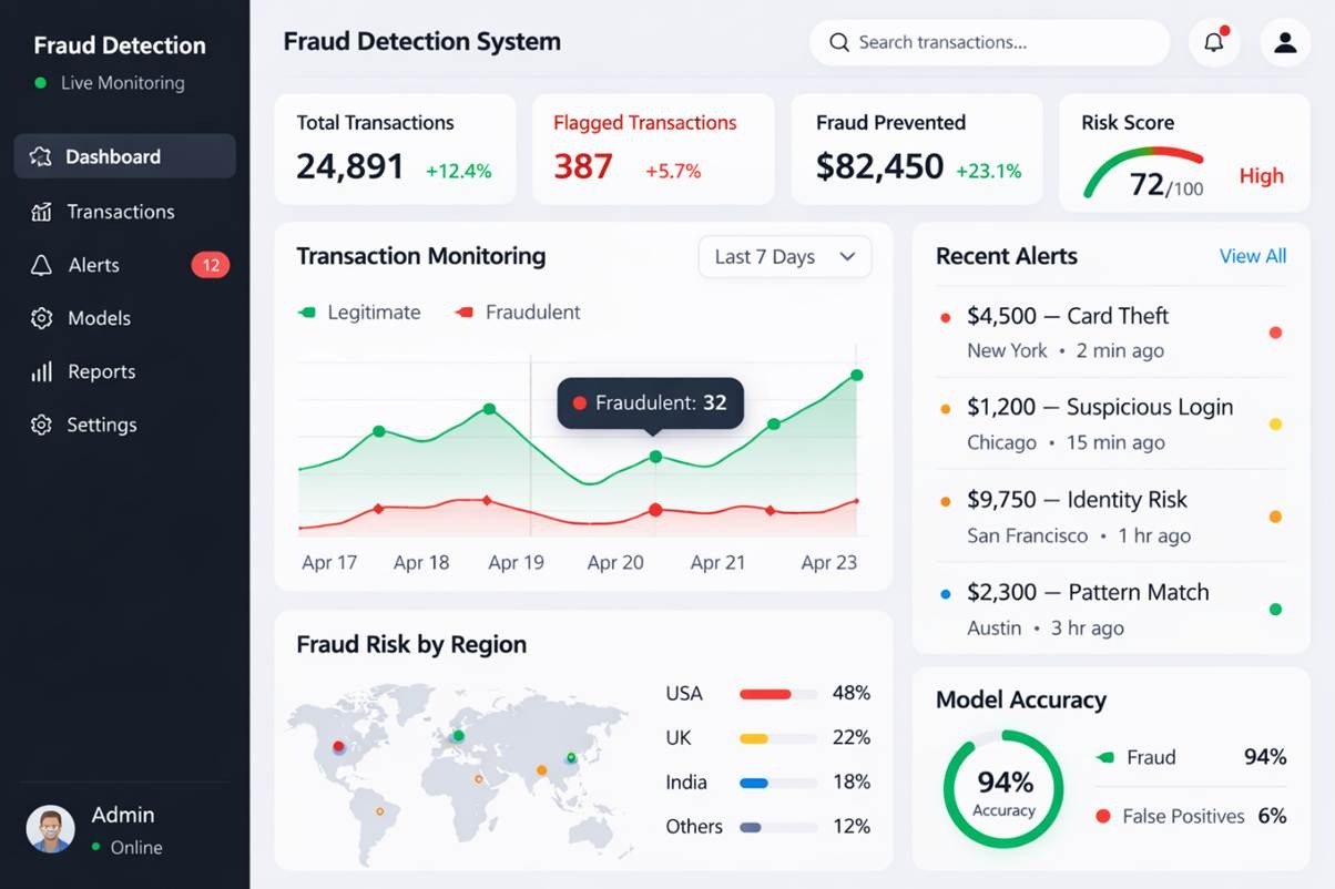 Financial institutions and online platforms face increasing risks from fraud and cyber threats. AI-powered fraud detection systems analyze transaction patterns, user behavior, and historical data to detect suspicious activity in real time.