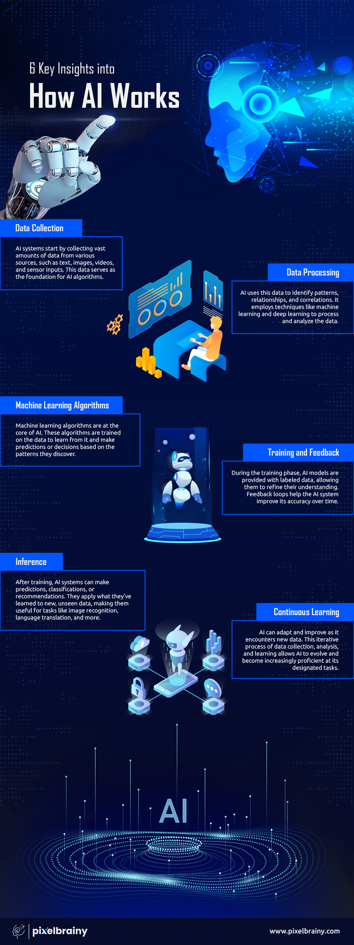 In this blog, our aim is to provide a simplified yet comprehensive understanding of how AI works. We will explore the historical background of AI, from its introduction by pioneering minds to its evolution into a dynamic field. Our journey will also lead us through the core processes of AI, including data collection, processing, machine learning algorithms, and continuous learning. We will uncover the advantages AI brings to various industries, and we will delve into the specific ways it has transformed sectors like healthcare, finance, energy, and more.