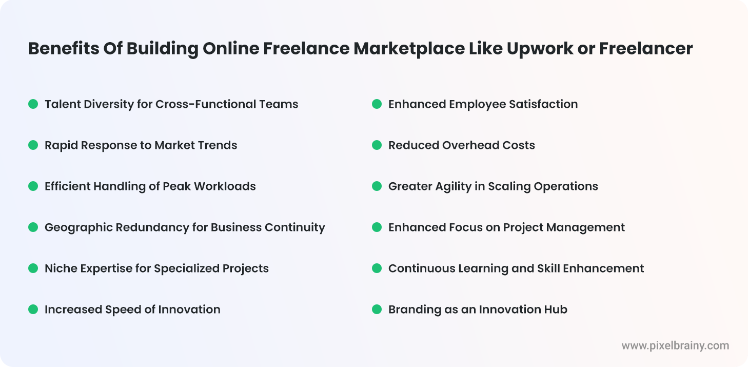 Building an online freelance marketplace goes beyond the well-established advantages of accessing a global talent pool, flexibility, and cost-efficiency that we mentioned in why one should consider investing in marketplaces like Upwork and Freelancer.