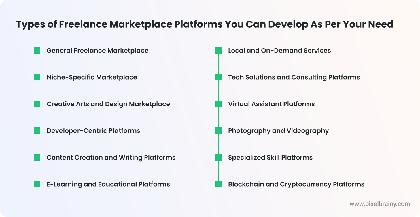 The freelance marketplace landscape has evolved significantly, offering diverse platforms catering to specific needs and industries. Entrepreneurs and businesses seeking to enter this dynamic space have the opportunity to develop a freelance marketplace tailored to their target audience. Below are various types of freelance marketplace platforms, each designed to address specific requirements, industries, or modes of collaboration.