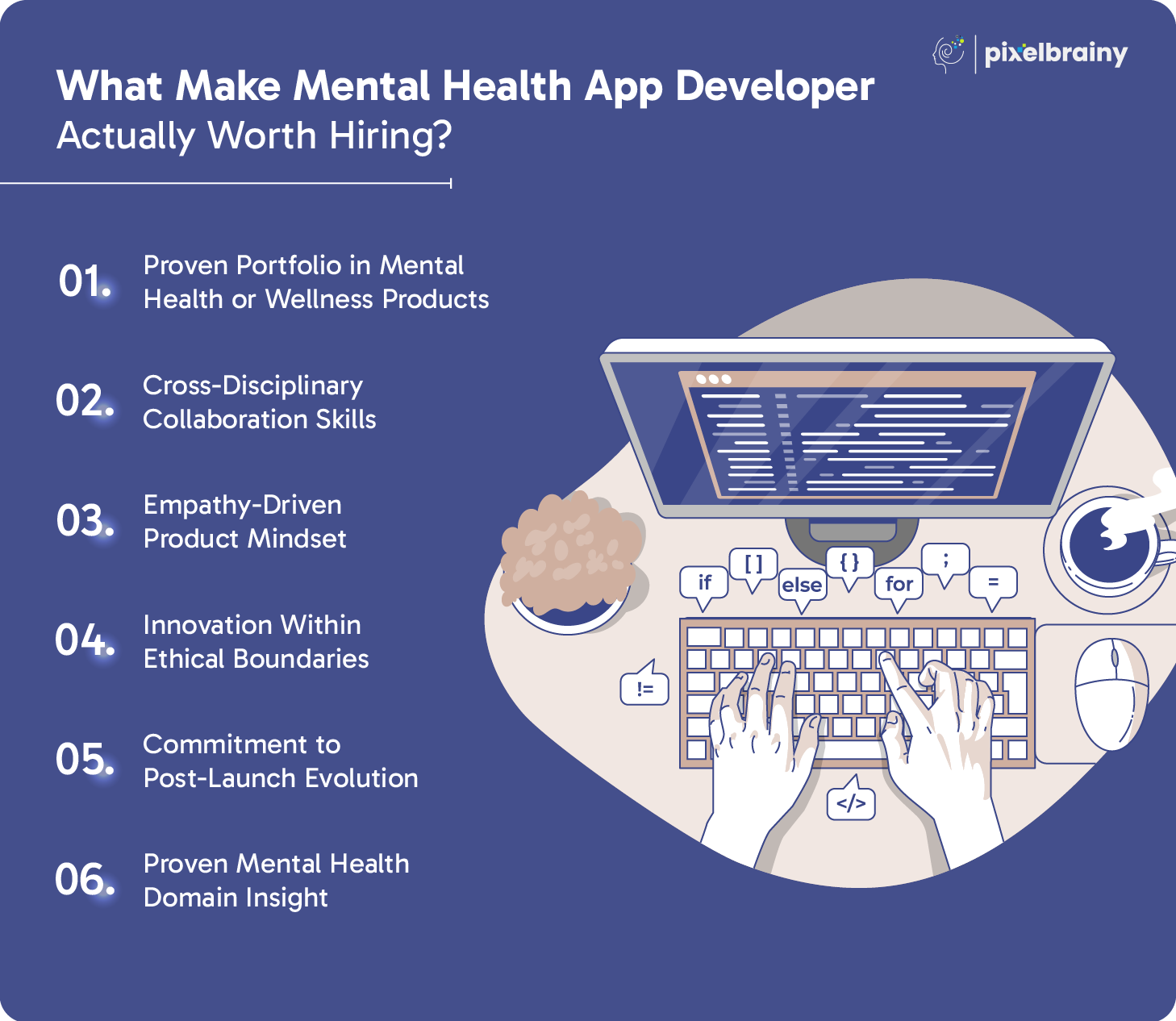 Look for developers with experience in digital health, knowledge of HIPAA and data security, a portfolio of mental health or healthcare-related projects, and strong collaboration and UX design skills.