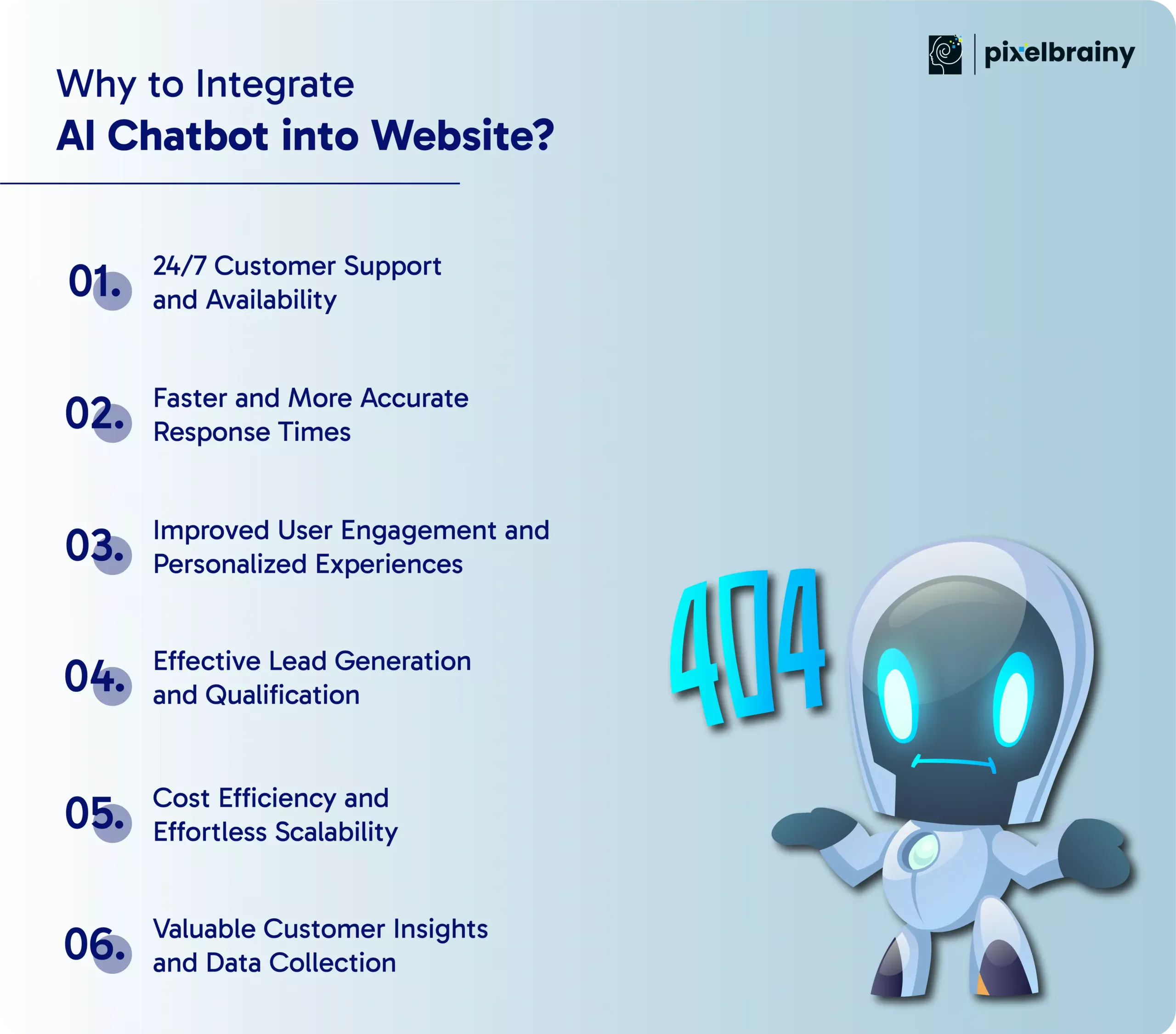 Here are six powerful benefits that make AI chatbot integration for website a smart business decision: