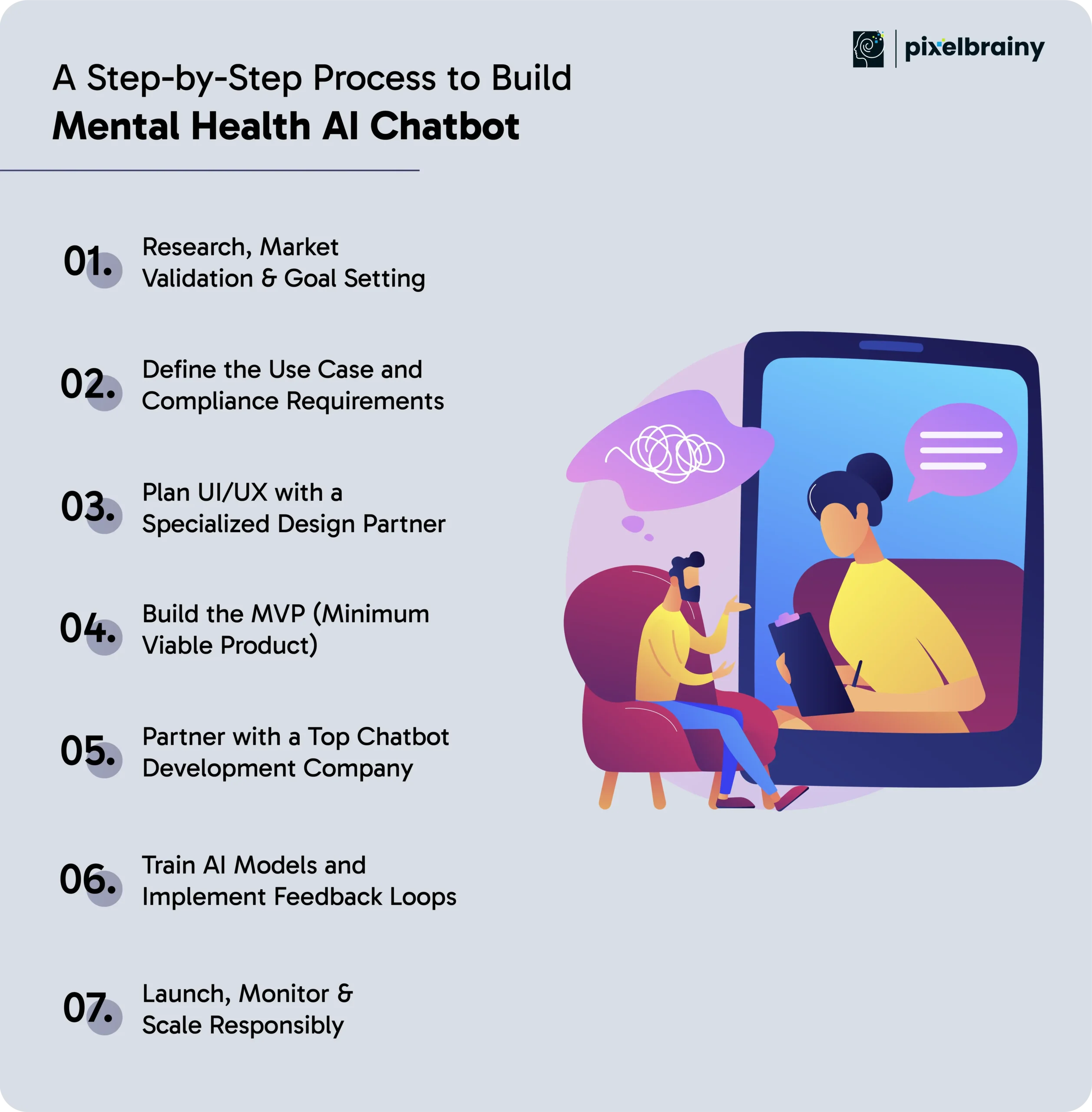 Begin by defining your target users and goals. From there, consult a mental health chatbot development expert like PixelBrainy to help with technical planning, feature prioritization, and MVP launch.