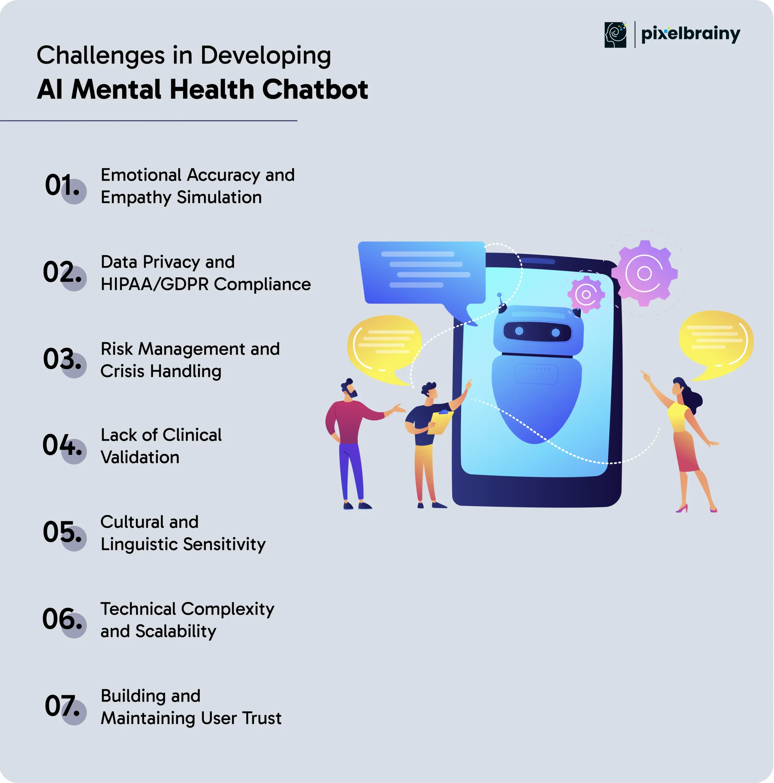 Here are the top challenges in AI mental health chatbot development, along with ways to effectively overcome them:
