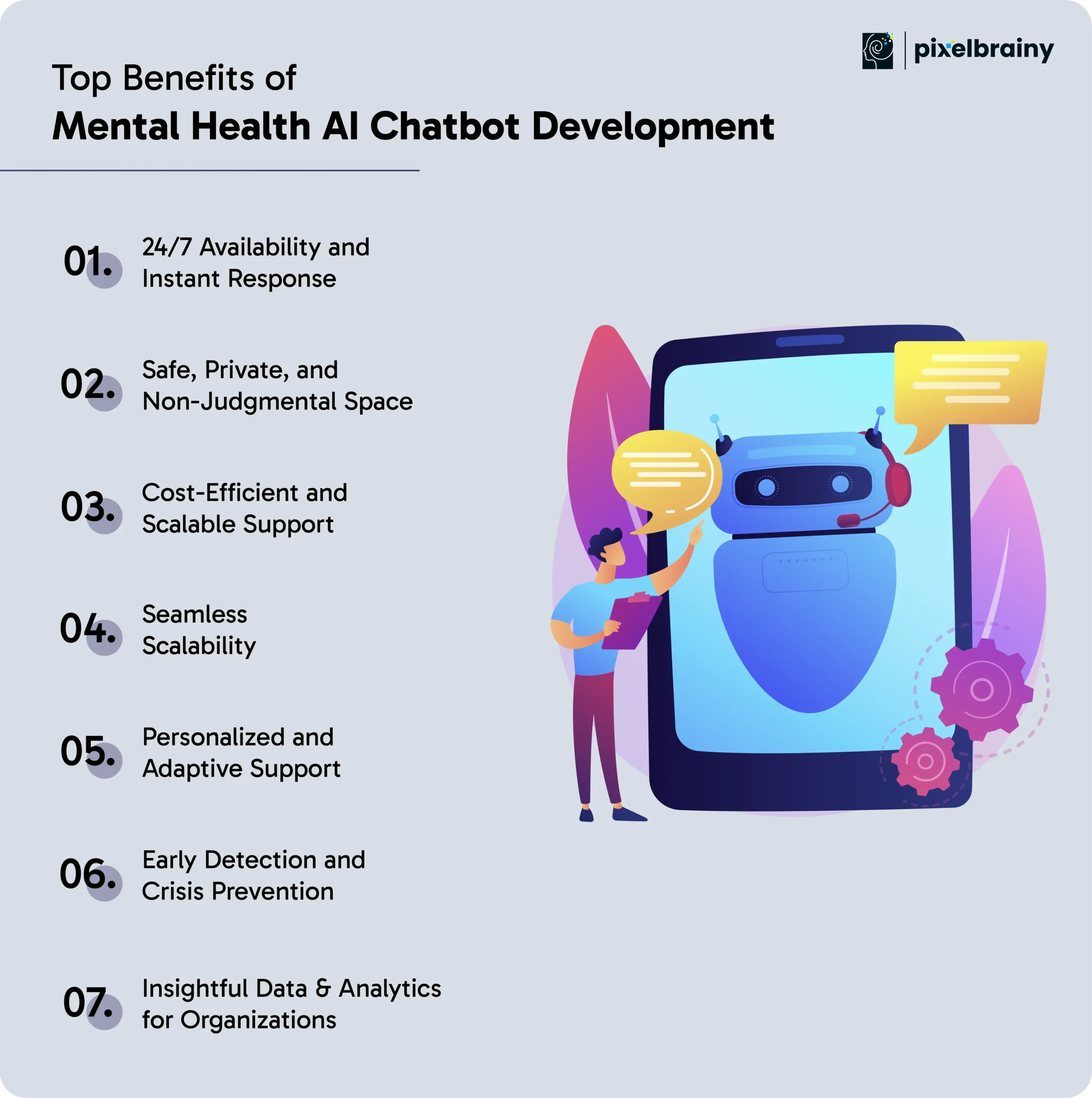 Here are the most impactful benefits of building a Mental Health AI Chatbot today: