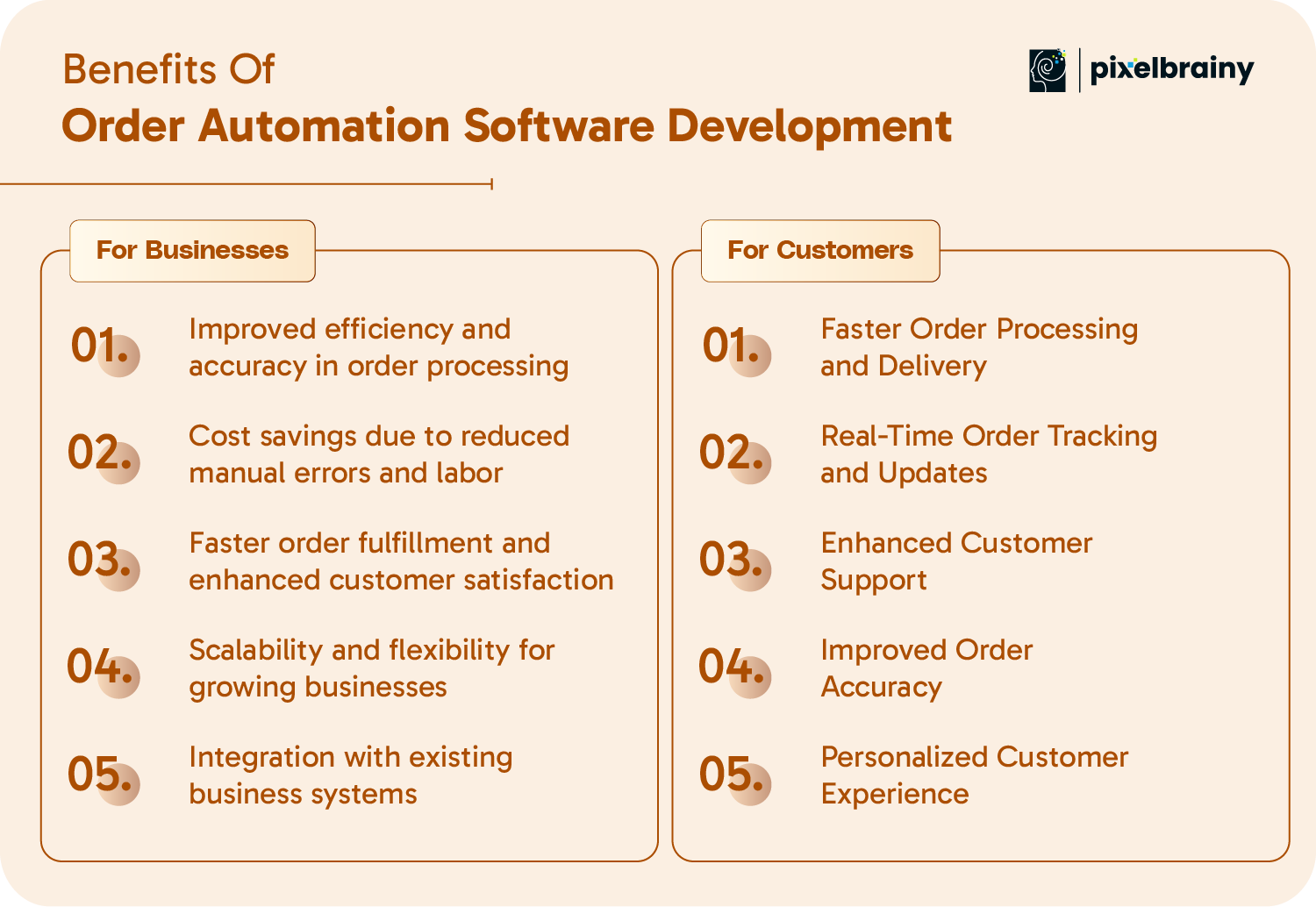 Choose PixelBrainy as your trusted development partner for custom order automation software development, and get cost-effective, scalable, and efficient solutions.