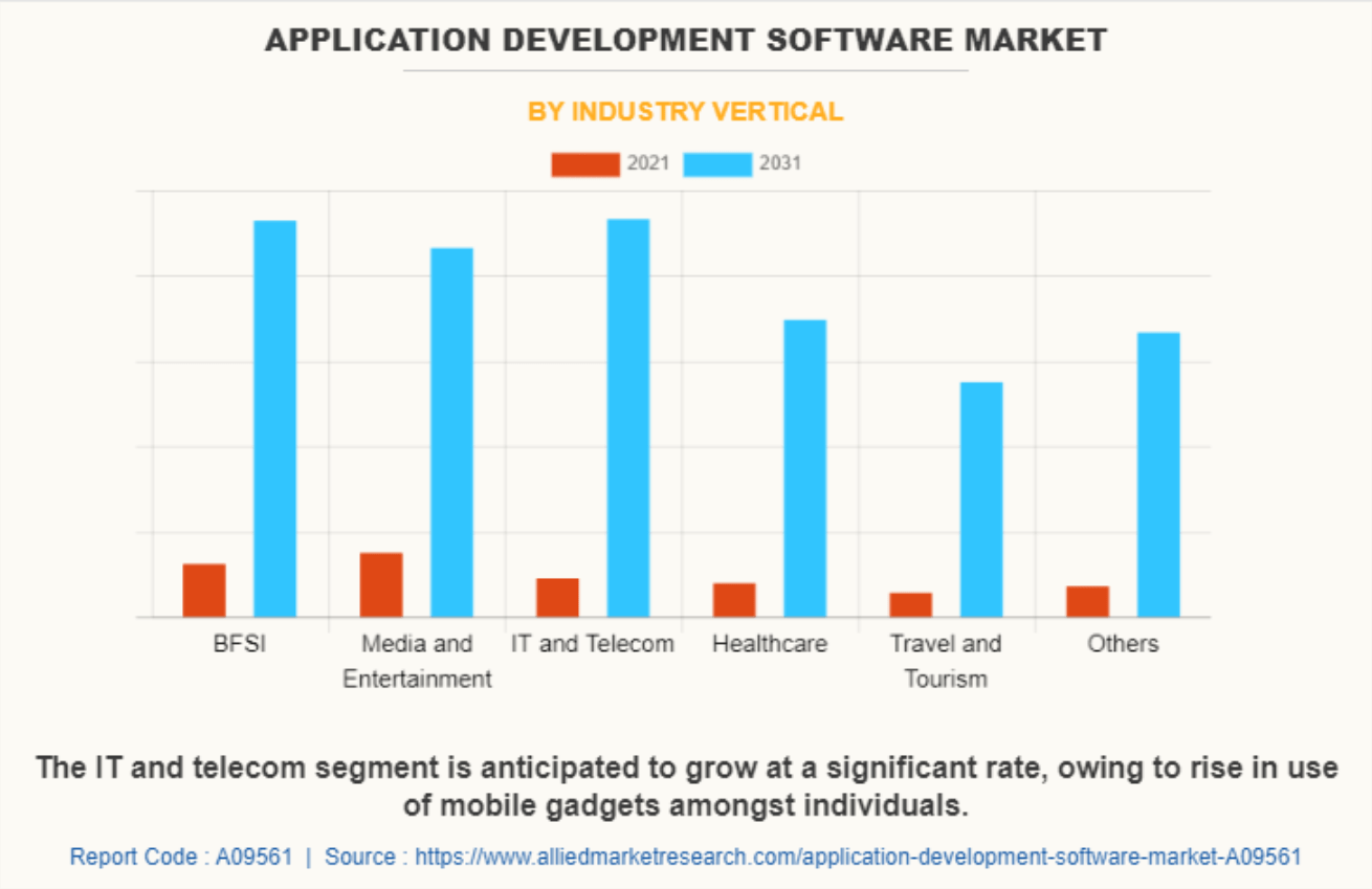 In 2021, the application development software market reached a value of $142.5 billion globally. It is expected to grow significantly, reaching approximately $1159.2 billion by 2031, with a compound annual growth rate (CAGR) of 23.5% from 2022 to 2031.