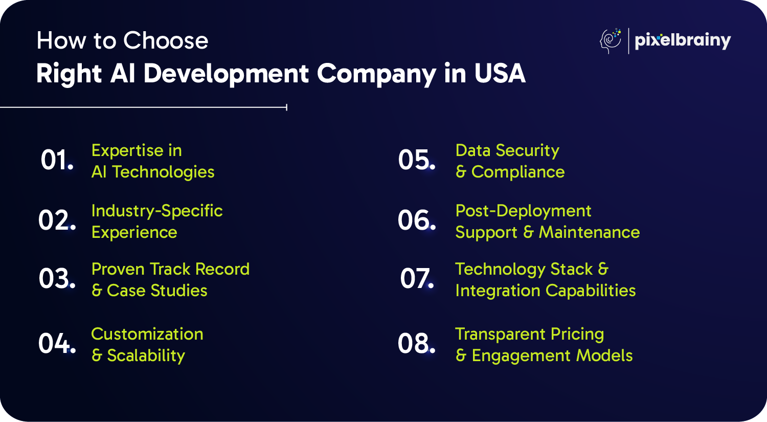 Evaluate their portfolio, domain experience, AI tech stack, and client reviews. Ensure they align with your project goals and provide strong post-deployment support.