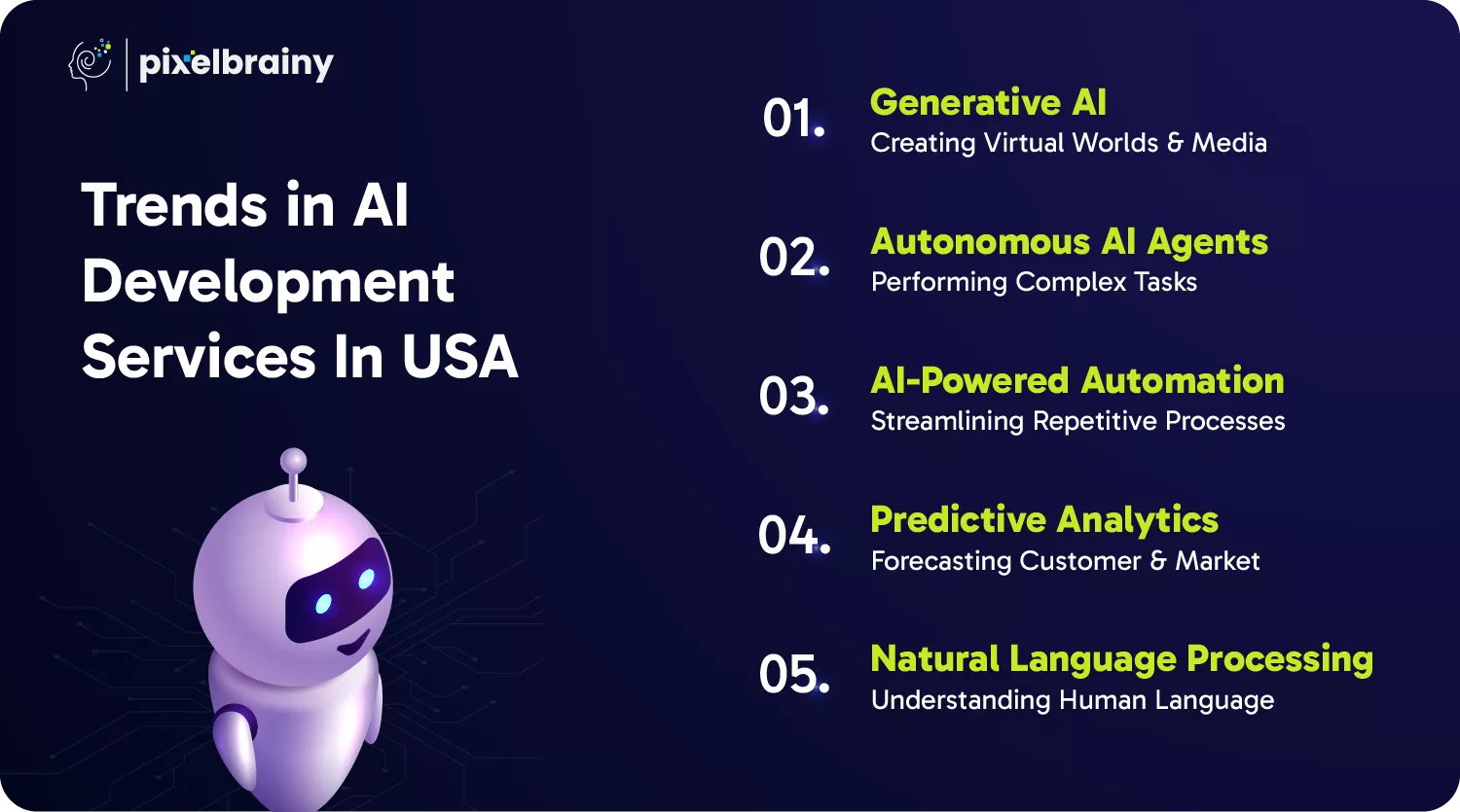 AI development in the USA is evolving rapidly, with businesses adopting cutting-edge technologies to improve efficiency, automation, and decision-making. Here are the key trends shaping AI development services: