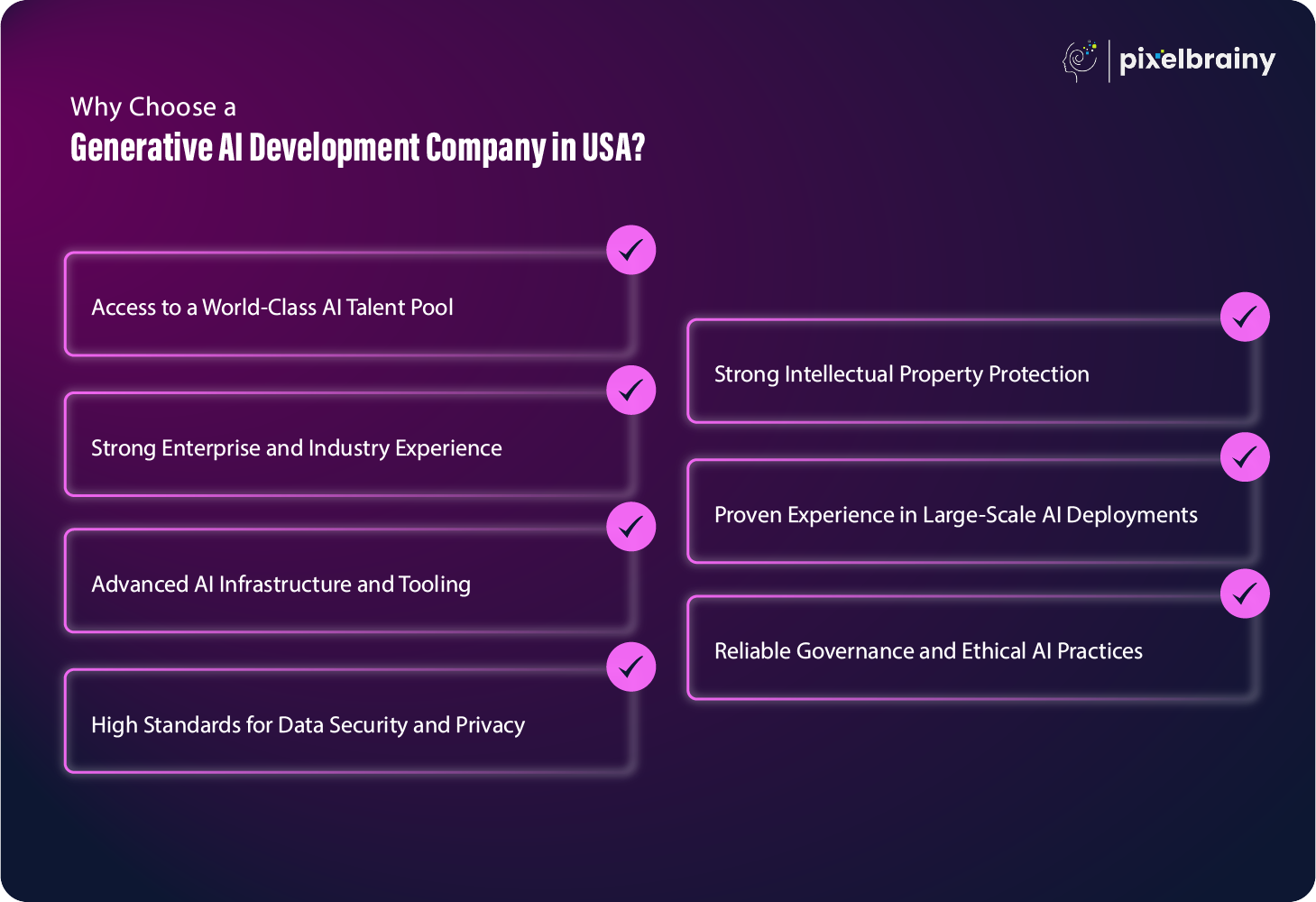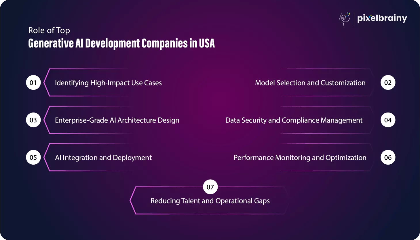 PixelBrainy has earned its position among leading generative AI development companies in USA through a clear focus on execution, flexibility, and business impact.