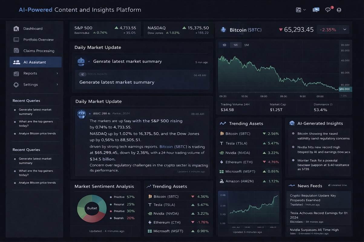 The client needed to deliver timely market insights, reports, and educational content to users while managing large volumes of financial data. Manual content creation limited scalability and responsiveness.