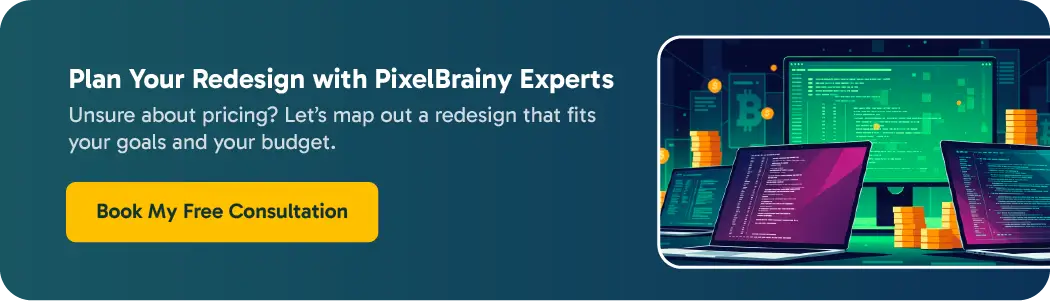 Note: This is a website redesign estimate; the final cost depends on the specific business needs, additional functionalities, and design requirements. Contact PixelBrainy, a web design and development company, for the exact cost according to your specific project needs.
