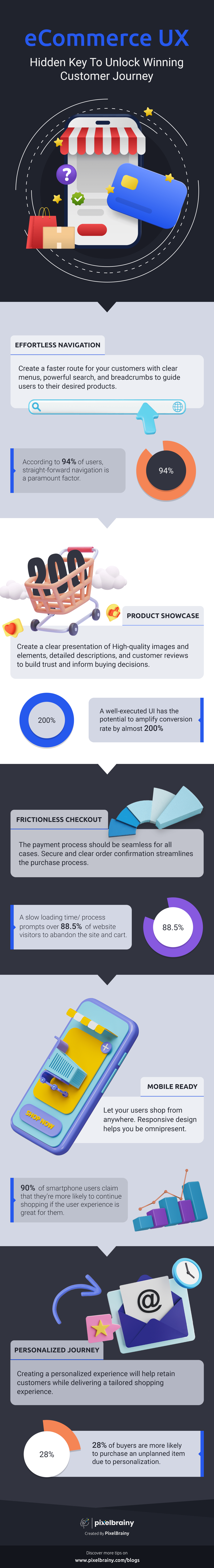 In this infographic, we are visually representing key tips that your eCommerce platform can leverage to deliver a better customer experience and establish understanding between customers and your brand. Let’s learn how focusing on UX can transform your eCommerce business, turning frustrated browsers into loyal customers! By implementing effective eCommerce design and development services, you can enhance the overall user experience and drive customer loyalty.